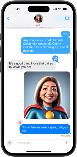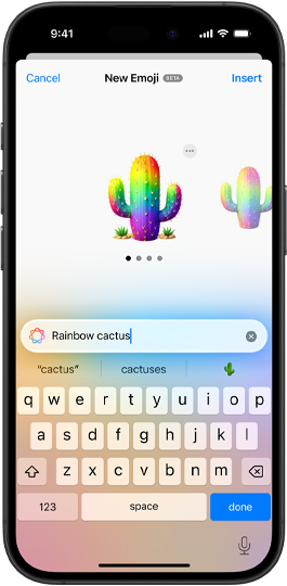 Create your own Genmoji to express yourself in ways that are personal to you. Type a description, or mix your favorite emoji to create something new. For Genmoji inspired by family and friends, choose from options like customizing hairstyle to match your friend’s latest look.