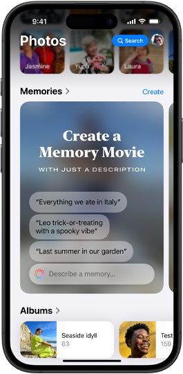 Create a custom memory movie of the story you want to see, right in Photos. Enter a description, and Apple Intelligence finds the best photos and videos that match. It then crafts a storyline with unique chapters based on themes it identifies and arranges your photos into a movie with its own narrative arc.