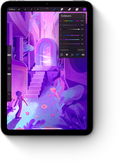 A user’s hand holding Apple Pencil Pro creating colourful artwork on iPad mini.