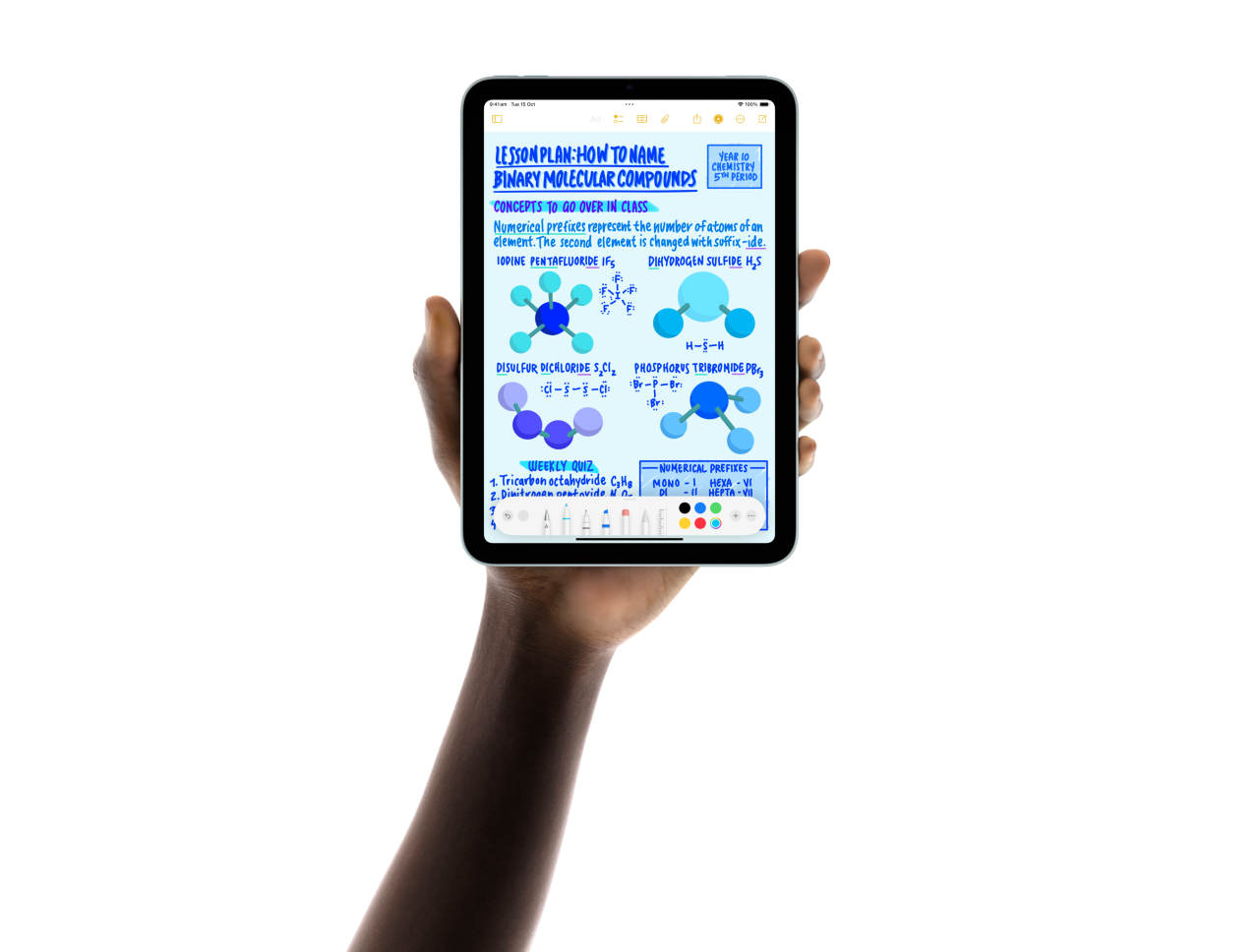 Five iPad mini models are shown in a fan formation held by a user‘s hands. One model shows the back camera, the other four are front-facing. Apple Pencil Pro is being used to take notes.