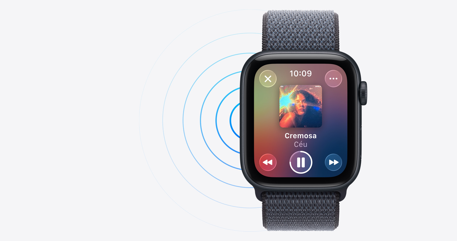 O SE 3 se conecta tranquilamente aos seus AirPods para você ouvir música, audiolivros ou podcasts sem usar as mãos6. E, se seus fones de ouvido não estiverem por perto, agora você pode reproduzir mídia pelo alto-falante do relógio.