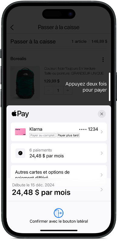 Apple Pay vous offre plus de flexibilité quand vous faites des achats en ligne et dans les apps sur iPhone et iPad. Au moment de passer à la caisse, vous pouvez régler le montant en totalité ou l’échelonner en plusieurs versements avec une carte admissible ou une autre option de paiement différé.2