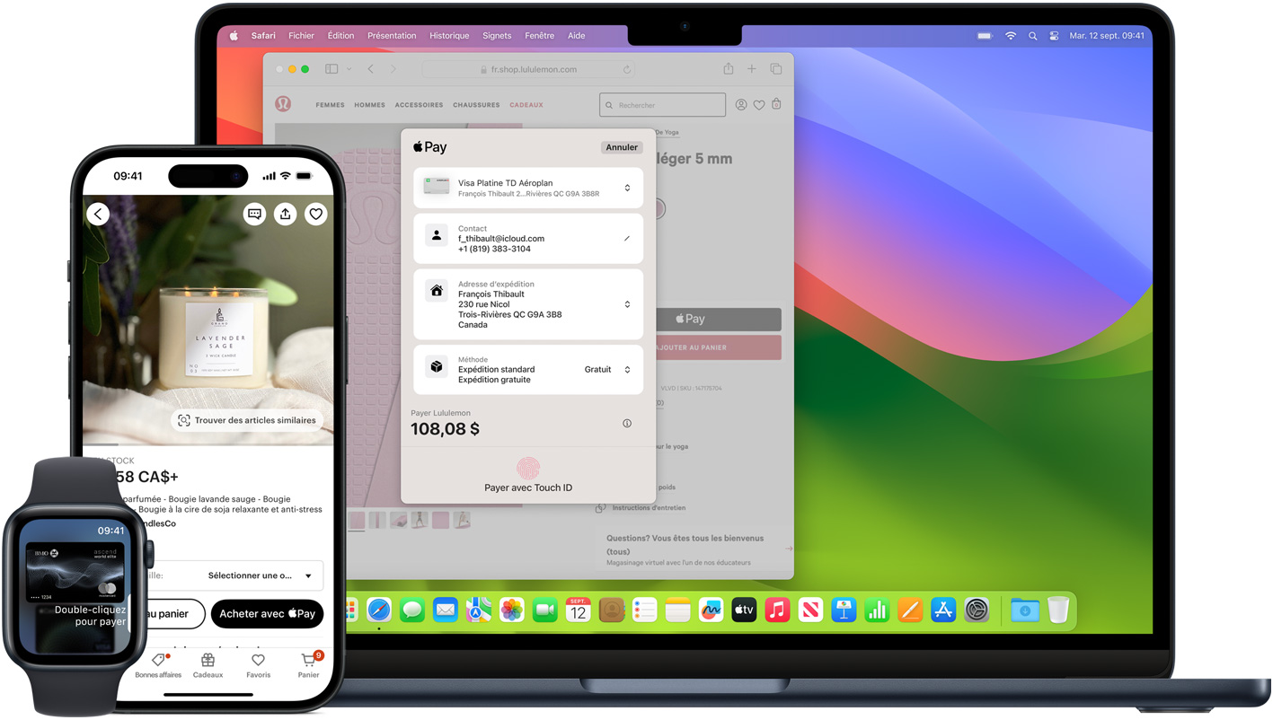 Quand vous payez en magasin, ni Apple ni votre appareil n’envoie votre numéro de carte au commerçant. Si vous payez dans Safari ou dans une app, le commerçant reçoit uniquement l’information dont vous avez autorisé la transmission pour que votre commande puisse être exécutée, comme vos nom, courriel, adresse postale et adresse de facturation.