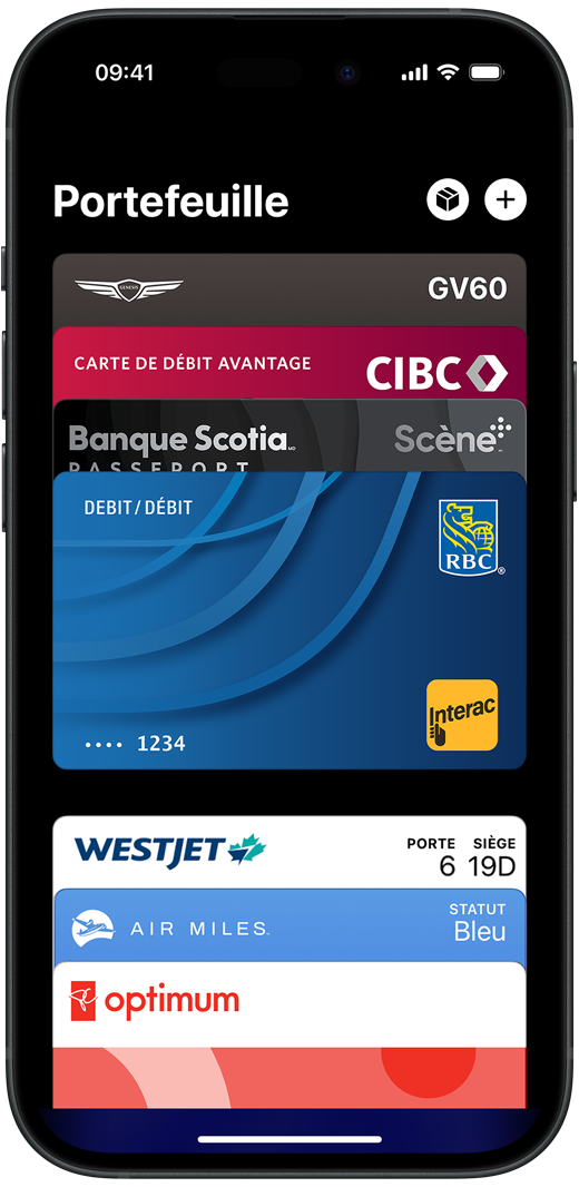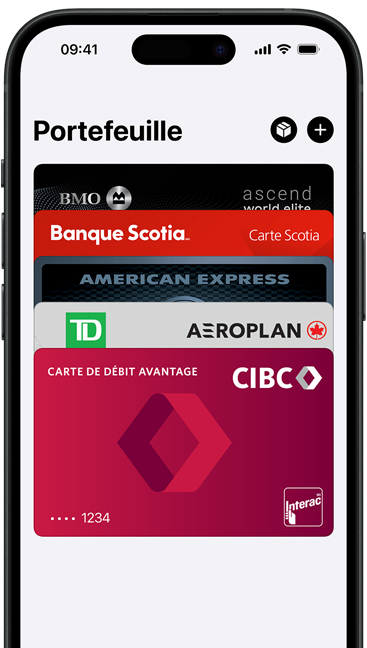 Si vous avez déjà ajouté une carte de crédit, carte de débit ou carte de fidélité compatible avec Apple Pay dans Portefeuille, double-cliquez sur le bouton principal pour ouvrir l’app, puis approchez votre appareil du lecteur. Sur