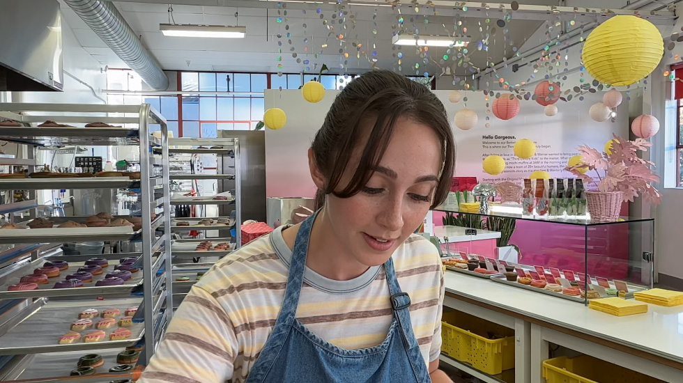 Woman on a video call working at a bakery.