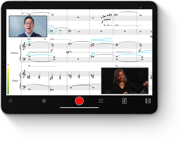 iPad Pro. El Dr. Kim desarrolla apps para iPadOS que acercan a las personas y facilitan la colaboración. Su app Virtual‑Chorister registra grabaciones individuales e interpretaciones de músicos de todo el mundo para crear grupos musicales virtuales.
