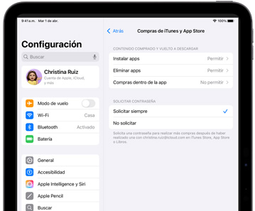 Si quieres, puedes impedir que tus hijos instalen nuevas apps en sus dispositivos. Por ejemplo, apps de redes sociales o para compartir fotos. Incluso puedes desactivar el navegador web Safari. Activa Solicitar la Compra y podrás aprobar o rechazar desde tu propio dispositivo las compras y descargas de apps que tus hijos quieran hacer.