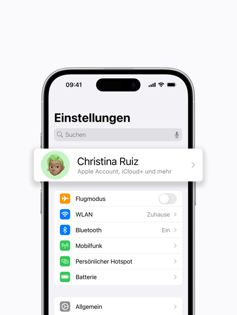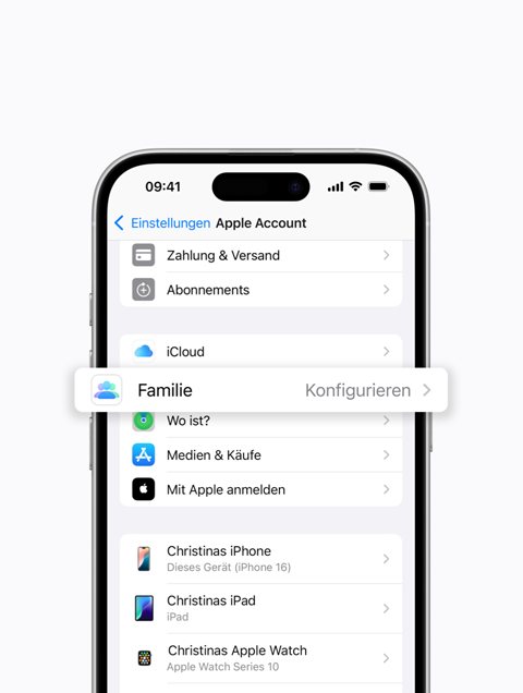 Du musst deine Gruppe als Familienorganisator:in einrichten und dann andere Mitglieder einladen, ihr beizutreten. Öffne zuerst „Einstellungen“. Tippe dann auf deinen Namen, dann auf „Familie“ und folge den angezeigten Hinweisen, um Familienmitglieder einzuladen.
