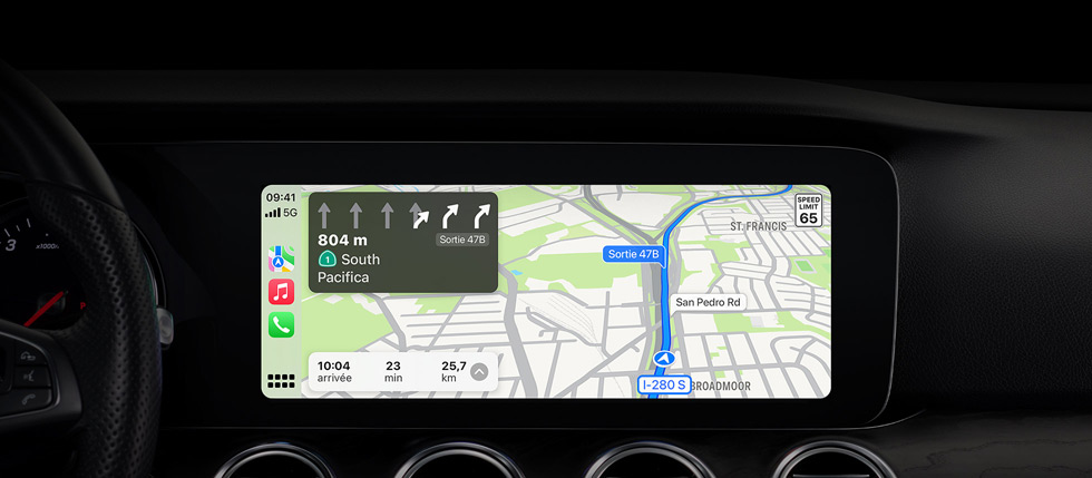 CarPlay met toute la puissance et la simplicité de Plans derrière le volant. Vous pouvez recevoir des suggestions intelligentes en fonction des données que vous stockez déjà sur votre appareil, telles que les adresses issues de vos e‑mails, SMS, contacts et calendriers. Et avec une cartographie détaillée et des itinéraires guidés étape par étape, il est plus simple que jamais d’arriver à bon port.