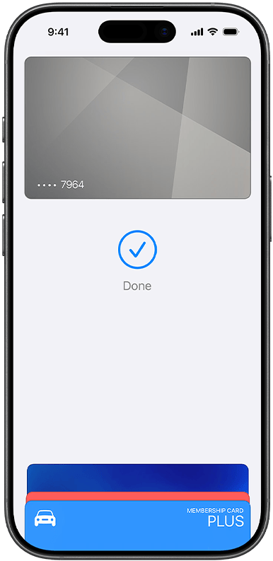 • A betéti és hitelkártyákat nagyon egyszerű felvenni a Tárca appba: csak koppints a pluszjelre, és érints hozzá egy erre alkalmas kártyát az iPhone-od hátoldalához.1 Manuálisan is hozzáadhatod kártyáidat, ha megnyitod a Tárca appot, a pluszjelre koppintasz, és követed a megjelenő utasításokat. Ezután igazolnod kell az adataidat a bankodnál vagy a kártyád kibocsátójánál. Ha rendelkezel párosított Apple Watchcsal, az órádon is hozzáadhatod a kártyát. Amikor új iPhone-ra váltasz, egyetlen egyszerű lépésben átviheted a kártyáidat az új eszközre.