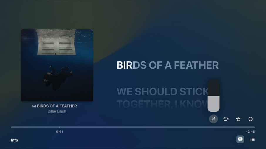 Több mint 100 millió dal, 30 000 lejátszási lista és élő rádió vár a nagy képernyőn. Az Apple Music Singgel te lehetsz a sztár6 – énekeld a legjobb dalokat valós idejű dalszövegekkel és szabadon állítható vokálokkal. Választhatod a főszólamot, az énekessel közös duettet, sőt a háttérénekesek közé is beállhatsz.4 Akár az iPhone-odat is használhatod mikrofonként, és a tévéd felhangosítja a hangodat.