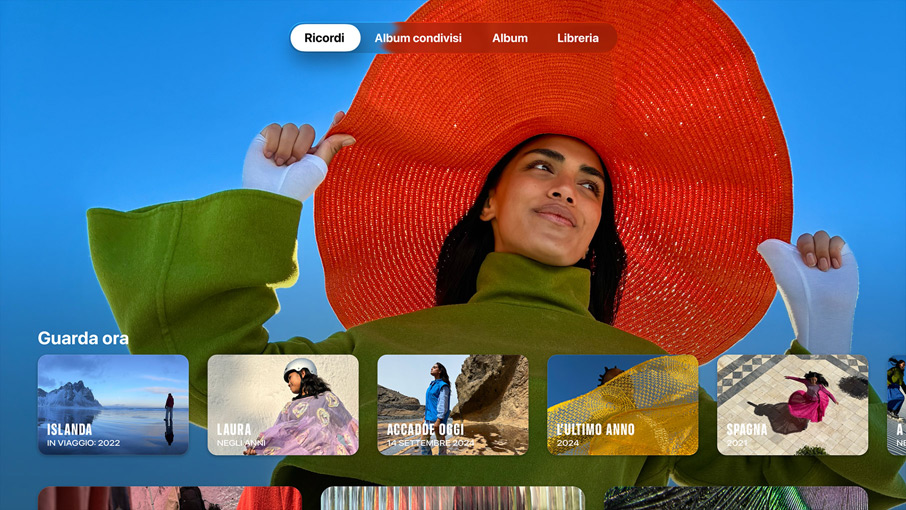 Foto. Con la Libreria foto condivisa di iCloud puoi invitare tutta la famiglia a collaborare alla creazione di un album di immagini e video da guardare direttamente sulla TV. E per rivivere alla grande i tuoi momenti speciali, puoi impostare l’album Ricordi come salvaschermo.
