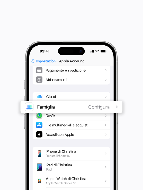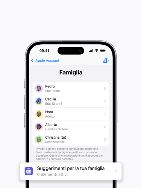 • Per indicazioni su come usare al meglio le funzioni per la famiglia, apri Impostazioni, tocca il tuo nome, quindi seleziona Famiglia e poi “Suggerimenti per la tua famiglia”.