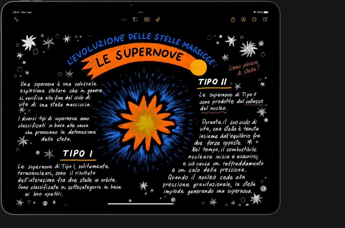 Disegna, dipingi, prendi appunti: Apple Pencil rende tutto più intuitivo, più facile, quasi magico. È precisa al pixel, ha una bassa latenza, cambia il tratto in base all’inclinazione. Mentre la usi puoi appoggiare la mano sullo schermo, proprio come faresti su un foglio. E Apple Pencil Pro ti aiuta a dare vita alle tue idee con funzioni ancora più evolute.3