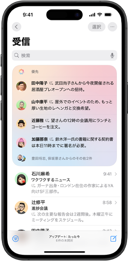 メールの優先メッセージは、今日中に返事が必要な招待や午後に乗るフライトのチェックインリマインダーなど、緊急のメッセージを受信ボックスの上部に表示