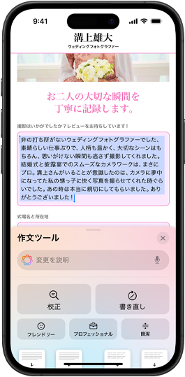 賢い作文ツールはコミュニケーションの方法を一変させます。書いた文章を校正する。思い通りのトーンや言葉づかいになるまで、いくつものバージョンを提案する。選択した文章の要約も、たった1回タップするだけ。