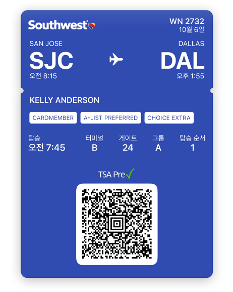 Southwest 탑승권은 추후 지원될 예정입니다.
