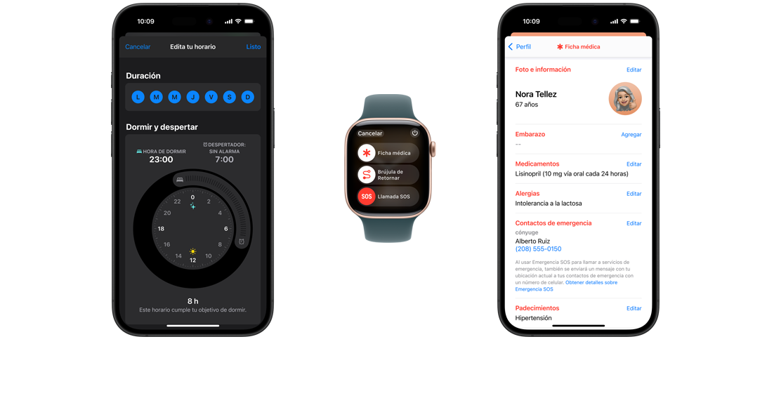 El personal de los servicios de emergencia puede acceder rápidamente a una Ficha Médica en tu iPhone o Apple Watch para ver información importante como grupo sanguíneo, alergias, contactos de emergencia y mucho más.