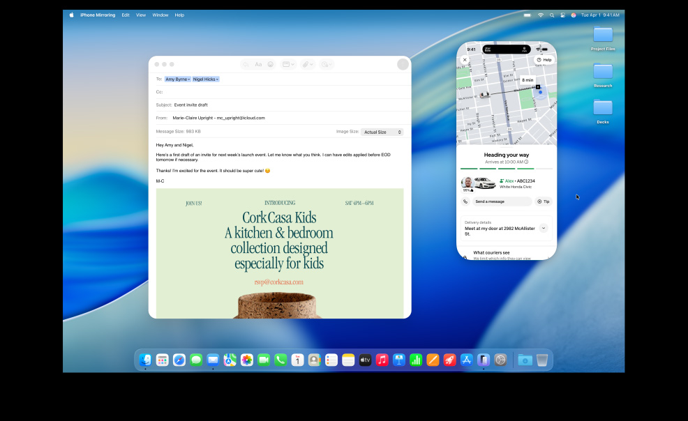 iPhone Mirroring lets you see and use your iPhone right from your Mac.5 So even if your phone is getting charged across the room, you can still access all your favorite iPhone apps. Live Activities from your iPhone also appear on your Mac. So when timely events occur — like when your Uber arrives — you don’t have to reach for your phone to stay in the know. You can even drag and drop a video from your Mac to your iPhone, so you can continue editing on the go.