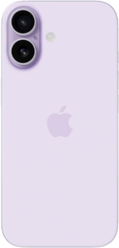 iPhone 17 front exterior with Dual Fusion Camera System, rear exterior, lavender color.