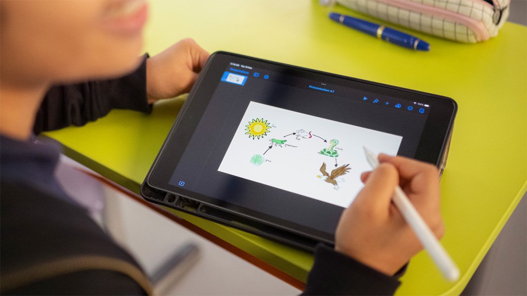 En una clase de biología, los alumnos crean GIFs animados en Keynote para darle vida a las cadenas alimenticias interdependientes y profundizar sus conocimientos de la materia, mientras desarrollan valiosas habilidades creativas. Y como en cada salón hay un Apple TV, pueden presentar fácilmente lo que han creado y aprendido.
