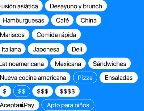 En Mapas es rápido y sencillo encontrar lo que buscas. Usa los filtros ultraespecíficos para buscar restaurantes por especialidad, rango de precios o con opción de comida para llevar. O elige ver sólo los lugares que estén abiertos en ese momento. ¿Quieres ampliar tu búsqueda? Sólo tienes que mover el mapa y los resultados se actualizarán automáticamente. ¿Buscas algo más cerca de tu casa? Con la funcionalidad Cerca de Aquí puedes encontrar lugares en tu zona, organizados por categorías como restaurantes, gasolineras, cafeterías, hoteles, bares, comida rápida, tiendas y centros comerciales. Los sitios aparecen en el mapa con distintivos de diferentes colores, para ayudarte a localizarlos más rápidamente.