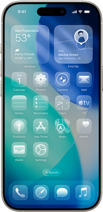 Wyświetlacz Liquid Glass z przejrzystymi ikonami aplikacji – Apple Music, Przypomnienia, Zdjęcia, Gry, Podcasty i FaceTime – które subtelnie rozmywają obraz tapety