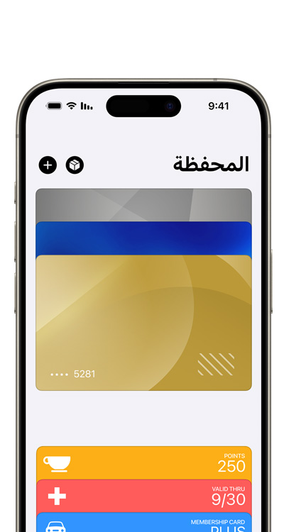 يشكّل تطبيق المحفظة جزءاً لا يتجزأ من iPhone، ويحفظ لك بكل أمان بطاقات الائتمان والسحب وبطاقات المواصلات وتذاكر الفعاليات والمفاتيح والمزيد في مكان واحد. ويعمل أيضاً بانسجام تام مع iPhone أو Apple Watch لتتمكن دائماً من حَمل المزيد من دون أن يزيد عليك الحمل.