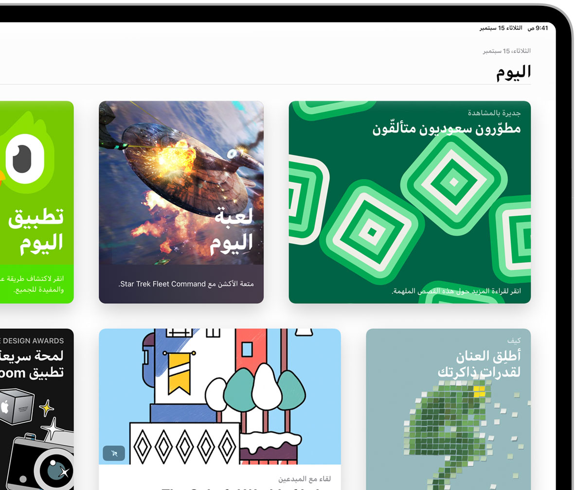 قصص أصلية بأقلام فريق تحريرنا تقدم لك كل ما تبحث عنه من عروض افتتاحية عالمية وحصرية وصولاً إلى مقابلات حول ما يجري وراء الكواليس. انقر على تبويب "اليوم" وتعرف على المطورين ومصممي الألعاب المميزين، وتعرف على بعض التلميحات والحيل الذكية، أو اطلع على كيفية مساهمة التطبيقات في تغيير طريقة عمل الناس ولعبهم وعيشهم.