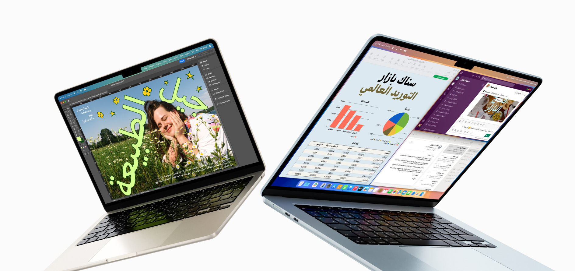 جهاز MacBook Air مقاس 13 إنش وجهاز MacBook Air مقاس 15 إنش مفتوحان جزئياً، وتعرض شاشة الجهاز الأول مشروع تصميم قيد التنفيذ، في حين أن شاشة الجهاز الآخر تعرض مثلاً عن إنجاز مهام متعددة باستخدام الإيميل وجداول بيانات