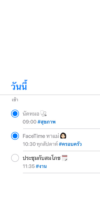 ทุกอย่างตั้งแต่ รายการสิ่งที่ต้องทำ จนถึงงาน โปรเจ็กต์ และยังสร้าง รายการเตือน ความจำได้รวดเร็วไม่ว่าคุณจะอยู่ที่ไหนด้วย Siri พร้อม ปรับแต่ง ลิสต์และการเตือนของคุณได้ด้วย เครื่องมือ อันทรงพลังต่างๆ ใช้ได้กับ