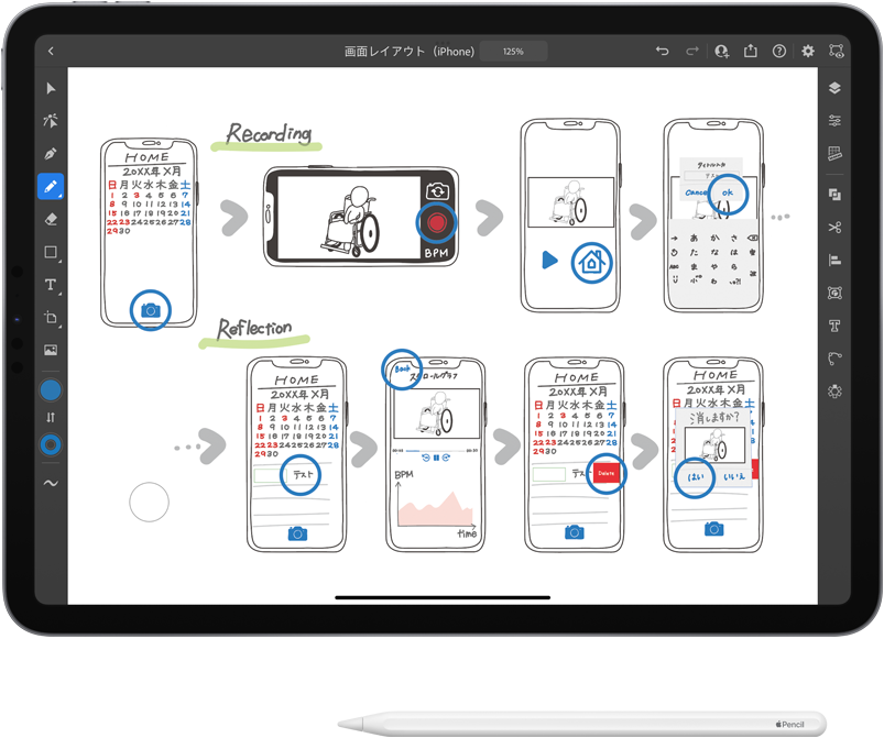 iPad Pro Dr. Iimura และนักศึกษาของเขาใช้ iPad, Apple Pencil และ Adobe Illustrator เพื่อสเก็ตช์ภาพและสร้างสตอรี่บอร์ดสำหรับไอเดียแอปการช่วยการเข้าถึงที่จะช่วยให้ครูผู้สอนสื่อสารกับนักเรียนที่ไม่สามารถสื่อสารผ่านคำพูดได้