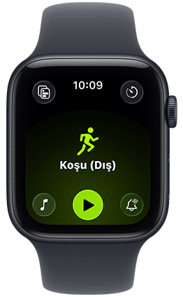 Apple Watch’u Keşfedin Üç Apple Watch modelinden ortadaki Siyah kordona sahip Naturel renkli Apple Watch'un kadranında koşu sırasındaki kalp atış hızı istatistikleri, sağdaki Deniz Yeşili kordona sahip Simsiyah Apple Watch'un kadranında Yaşam Bulguları, soldaki Koyu Turuncu kordona sahip Yıldız Işığı Apple Watch'un kadranında bir Genmoji görünüyor