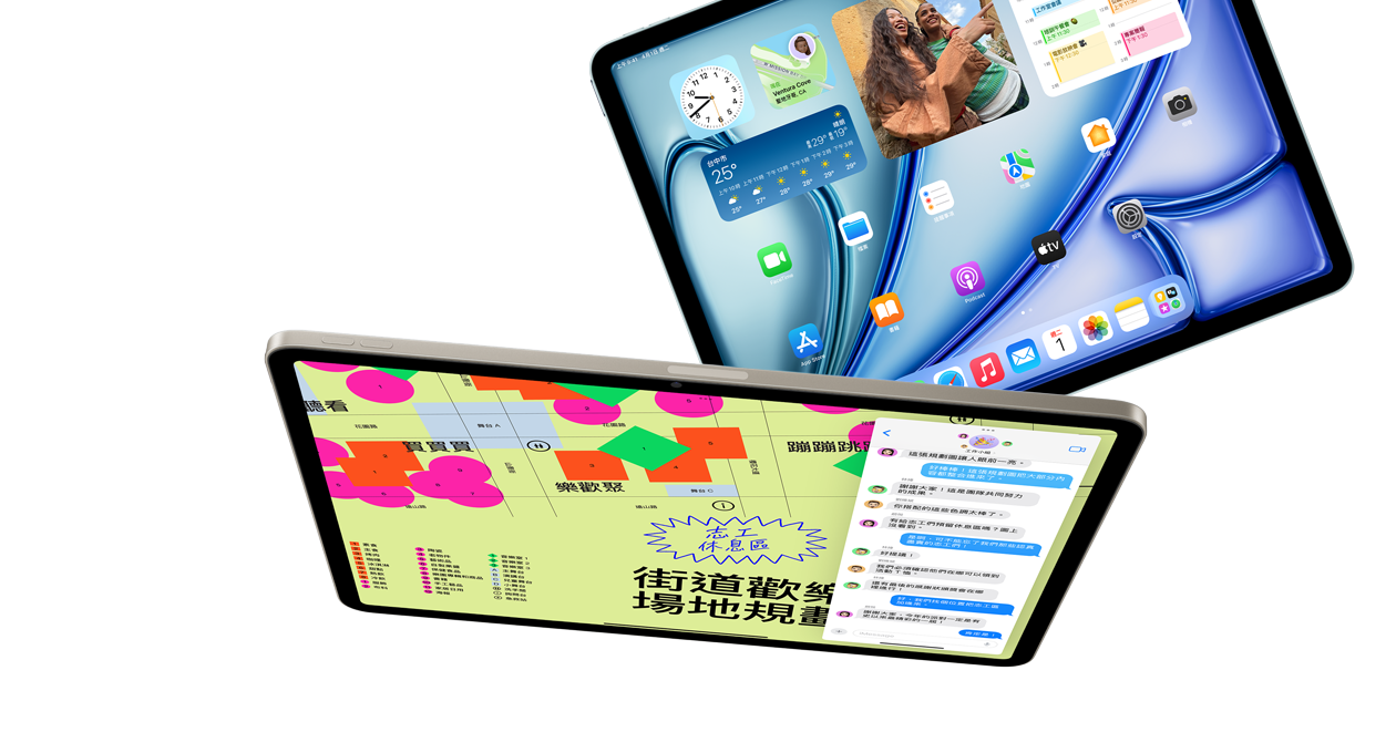 iPad Air 有 11 吋與 13 吋任你選擇,均配備絢麗的高解析度 Liquid Retina 顯示器,無論想用來做什麼,都能躍然眼前生動呈現。兩種尺寸的顯示器均明亮動人、反應靈敏且色彩精準,為你帶來出色的觀看體驗。