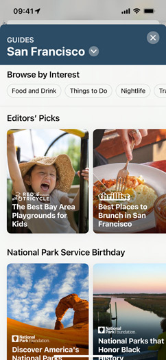 Choose a destination, and its interactive place card shows you everything you need at a glance. See basics like address, opening hours, website and phone number, along with details like price range, photo galleries, associated Guides, accepted payment types — even whether you can take your dog. Launch Flyover or Look Around to get a sense of the location and surroundings. You can even quickly and securely rent a bike, pay for parking, order food and more with just a tap.